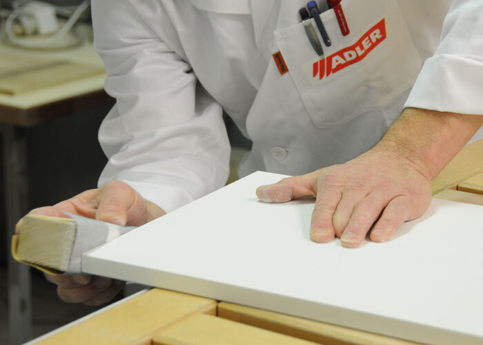Dobrze wypełniona i izolowana powierzchnia to podstawowy warunek uzyskania idealnego wysokiego połysku. W tym celu należy nanieść trzy warstwy lakieru wypełniająco-izolującego ADLER PUR-Isofill na krawędzie i jedną na powierzchnię pokrytą folią. Pierwsza warstwa naniesiona na krawędzie musi być pozostawiona na przynajmniej dwie godziny do wyschnięcia, a przed drugim naniesieniem należy wykonać szlifowanie papierem nr 320.